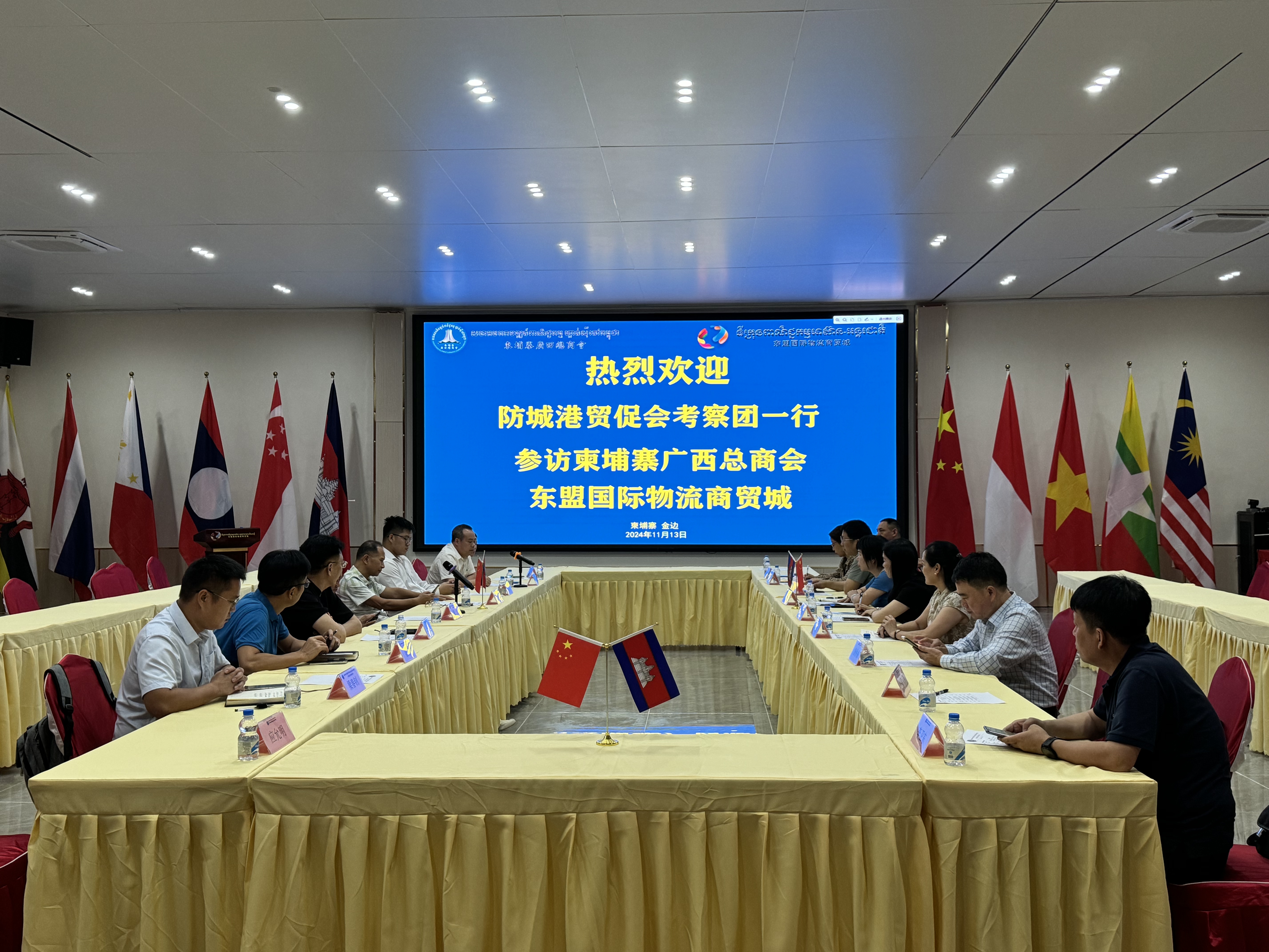 中国广西防城港市贸促会代表团11月13日到访柬埔寨广西总商会和东盟国际物流商贸城,双方就未来深化拓展各领域商机合作举行座谈。