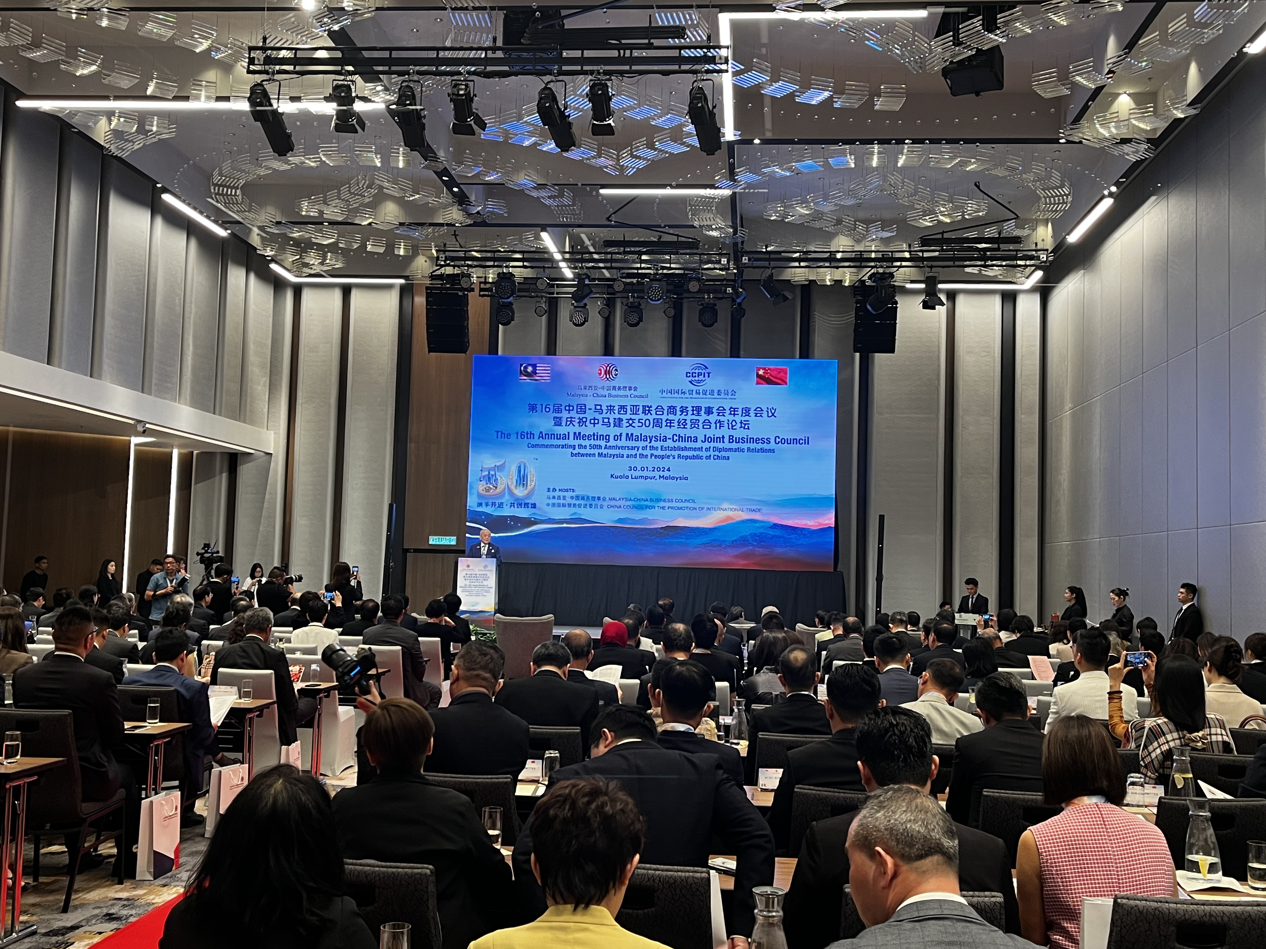 第16届中国—马来西亚联合商务理事会年度会议暨庆祝中马建交50周年经贸合作论坛由中国贸促会和马中商务理事会共同主办。马来西亚投资、贸易及工业部副部长刘镇东,马来西亚总理政治秘书曾敏凯,马中商务理事会执行委员会主席吴添泉,中国驻马来西亚大使欧阳玉靖等出席活动并致辞,中马工商界人士300余人参加活动。