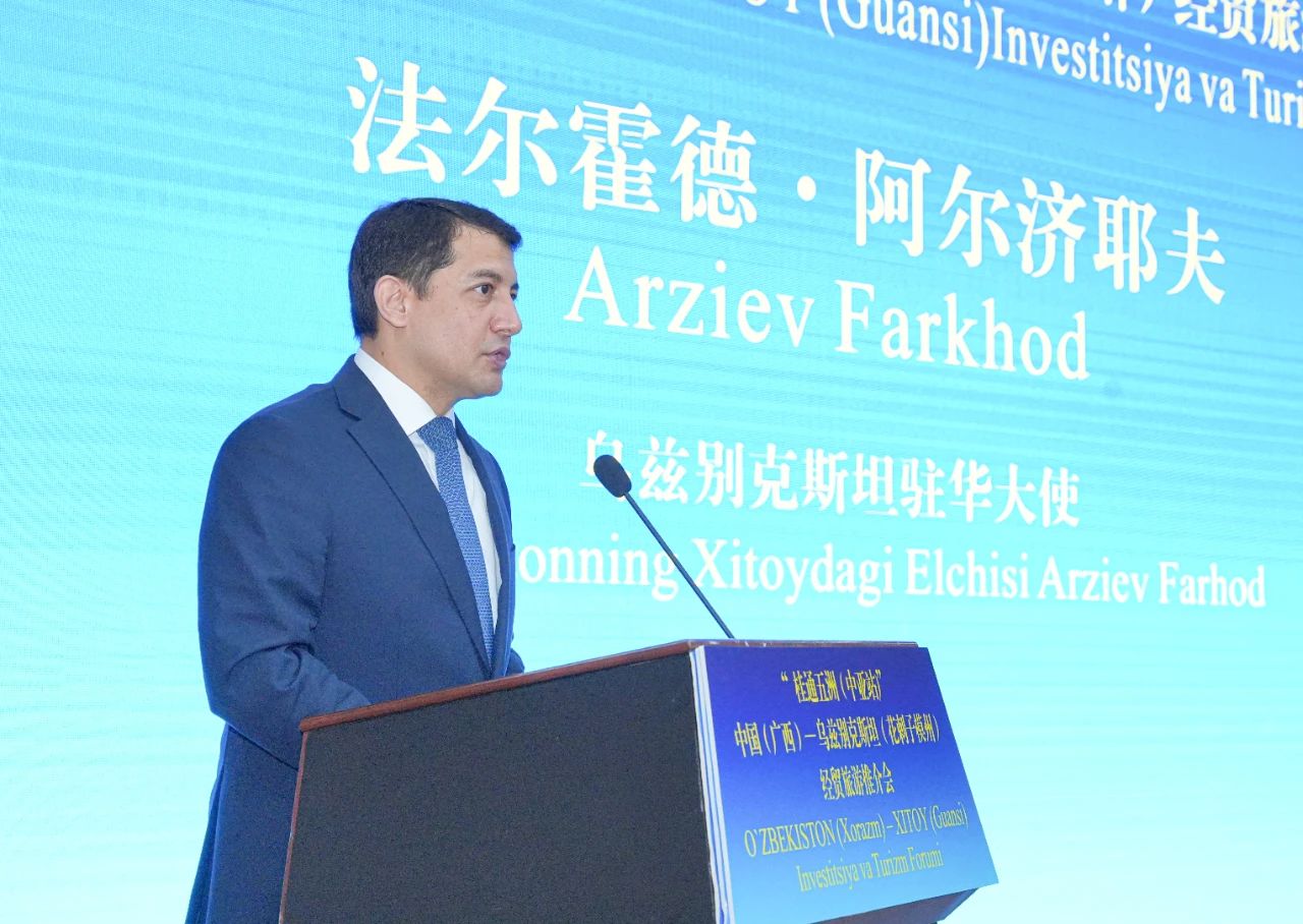 4月18日,乌兹别克斯坦驻华大使法尔霍德·阿尔济耶夫出席“桂通五洲(中亚站)”中国(广西)—乌兹别克斯坦(花剌子模州)经贸旅游推介会。