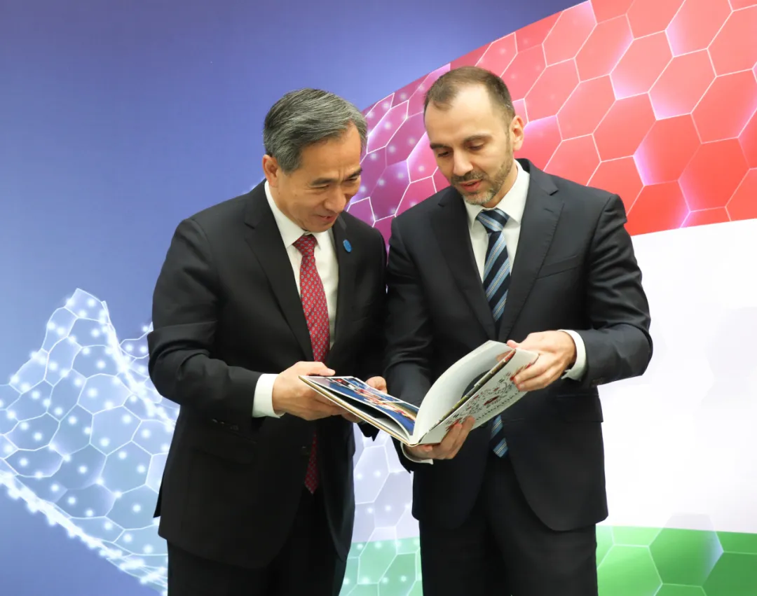 5月9日,中国贸促会会长任鸿斌向匈牙利国会经济委员会主席班基赠送链博会吉祥物链氪。