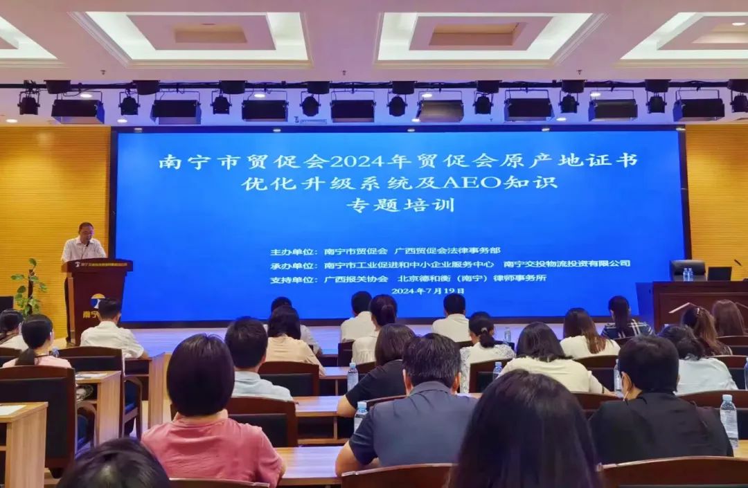 为积极推进中国贸促会原产地系统优化升级工作,指导企业顺利完成系统切换,保障原产地证书业务高效开展,并深化企业对AEO制度的认识,提升国际贸易便利化水平与国际市场竞争力,7月19日,广西贸促会法律事务部与南宁市贸促会在南宁共同主办了2024年原产地证书优化升级系统及AEO知识专题培训,围绕原产地证书系统优化升级情况和申请AEO流程进行了专家解读。