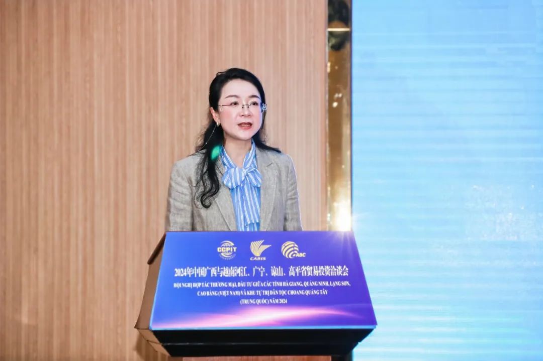 杨雁雁表示,近年来,广西与越南双边贸易规模不断扩大,经贸合作水平持续提升,从传统的农产品贸易拓展至新能源、新材料、智能制造等新兴领域。广西贸促会作为广西壮族自治区党委和政府联系经贸界人士、企业和团体的重要纽带,将充分发挥贸促会联通政企、融通内外、畅通供需的独特职能,利用中国—东盟商务与投资峰会、中国—东盟商务理事会平台与机制,与越南边境四省一道扩大各领域务实合作,赓续传统友谊,促进睦邻友好,助力构建具有战略意义的中越命运共同体。并提出三点合作建议,一是双方企业深耕合作潜力,共同开发东盟市场和国内市场、欧美市场;二是深化产业链供应链合作,打造优势互补、互利共赢的跨境产业链供应链;三是发挥好中国—东盟商务理事会和中国—东盟商务与投资峰会等机制和平台作用,帮助广西和越南的企业扩大经贸往来,开拓市场,寻找商机。