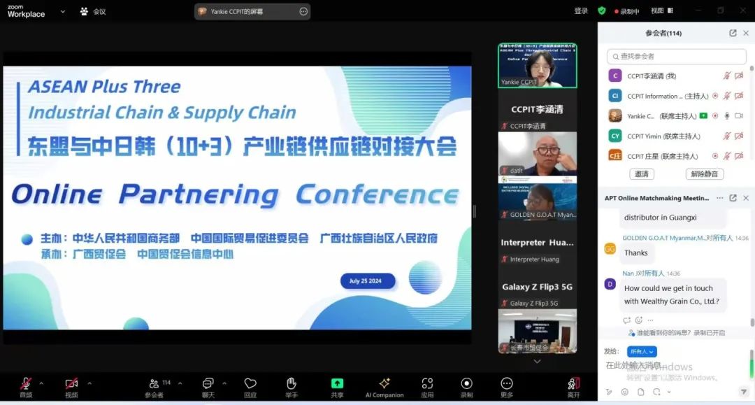 2024年7月25日,东盟与中日韩(10+3)产业链供应链对接大会——绿色农业、健康生活行业专题进口对接会线上成功举办,本次对接会由中国商务部、中国贸促会和广西壮族自治区人民政府主办,广西贸促会和中国贸促会信息中心承办。