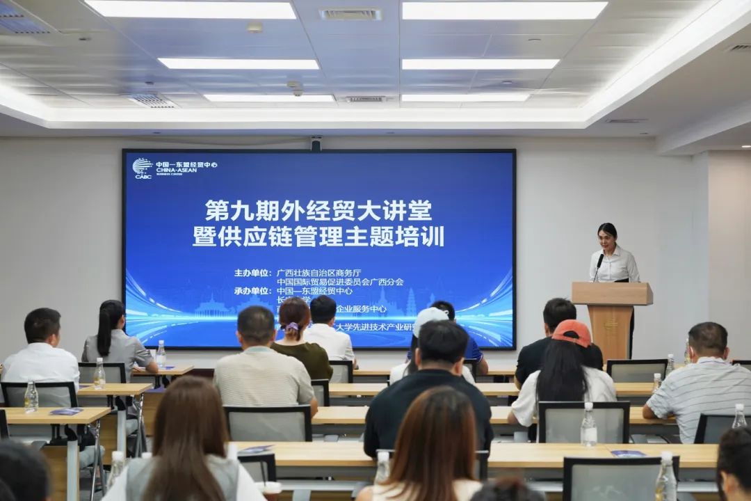 7月26日下午,由广西壮族自治区商务厅、广西贸促会主办,广西国际博览集团、长安大学、南宁工业促进和企业服务中心、南宁市国际商会、南宁市武汉理工大学先进技术产业研究院承办的第九期外经贸大讲堂暨供应链管理主题培训在中国—东盟经贸中心成功举办,来自广西区内各地市的商务主管部门及企业代表80余人参加培训。培训讲师分别就“广西保税物流:推动中国—东盟经贸合作的新动力”和“原产地优化升级系统专项培训及ATA单证册申办”主题进行深入的讲解和实操分析。互动交流环节中,企业代表积极与授课讲师探讨,现场氛围活跃,学员们表示受益良多。