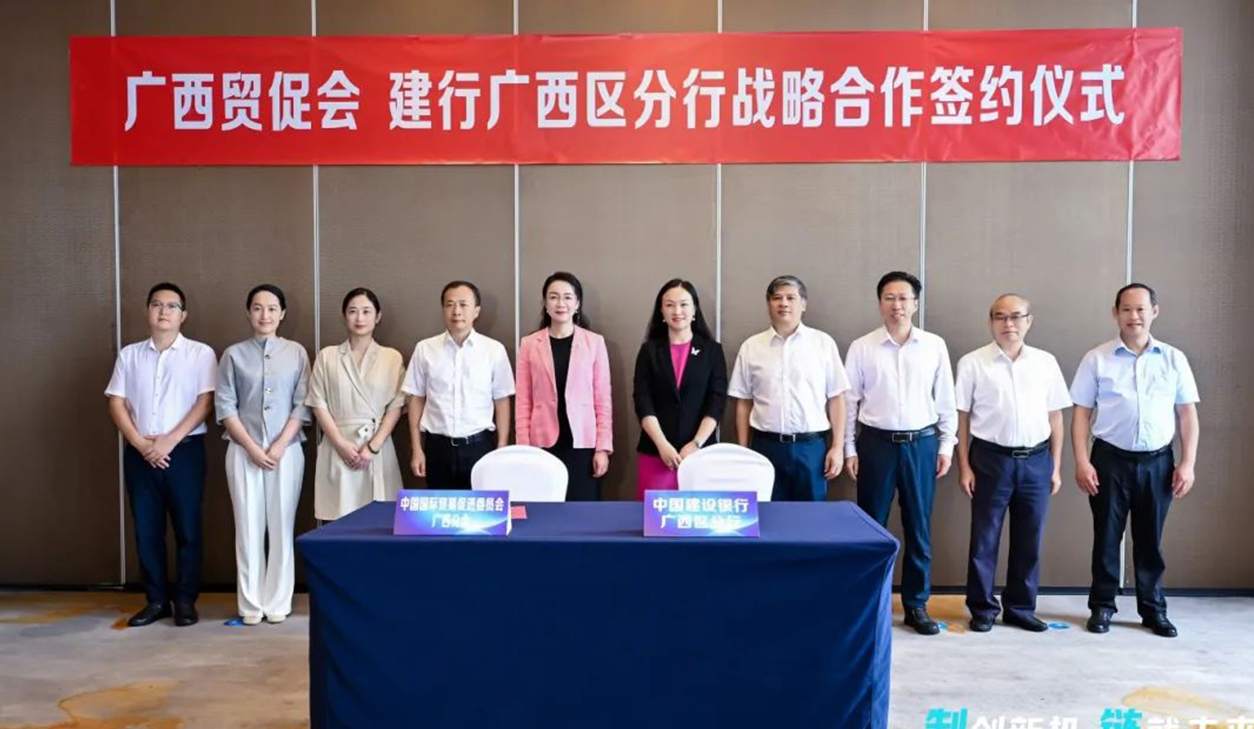 2024年8月13日,广西贸促会与中国建设银行广西区分行在南宁签署战略合作协议。广西贸促会会长杨雁雁、中国建设银行国际业务部资深副经理容洁、中国建设银行广西区分行副行长农卫东见证签约,广西贸促会二级巡视员邓梦彪、中国建设银行广西区分行副行长李海峰代表签约。