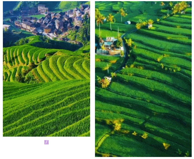 广西桂林龙脊梯田(左)与印尼巴厘岛德格拉朗梯田(右)