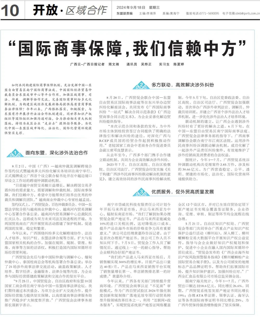 9月18日,《广西日报》刊发《“国际商事保障,我们信赖中方”》的文章,详细介绍广西贸促会在商事法律方面务实服务企业,助力打造中国—东盟区域市场化、法治化、国际化营商环境情况。特此转发,以飨读者。