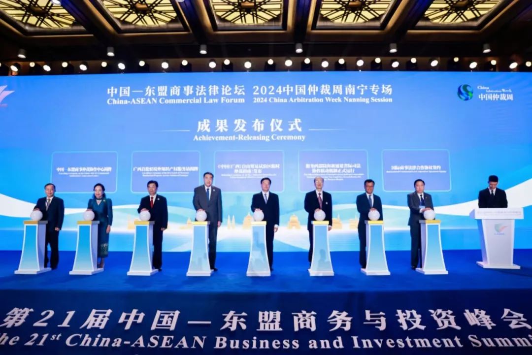 一是中国—东盟商事仲裁协作中心揭牌。中国—东盟商事仲裁协作中心是由广西壮族自治区人民政府、中华人民共和国司法部共同推进设立的国际商事仲裁交流协作平台,旨在深化拓展中国与东盟国家在仲裁领域的交流协作,推动建立中国—东盟商事仲裁协作机制,积极参与制定国际商事仲裁规则,强化商事争议多元化解决能力,为中国与东盟经贸往来提供商事法律保障。