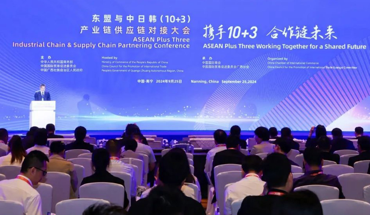 9月25日,东盟与中日韩(10+3)产业链供应链对接大会在广西南宁成功举办。本次大会由中国商务部、中国贸促会和广西壮族自治区人民政府共同主办,中国国际商会、广西贸促会联合承办,以“携手10+3 合作链未来”为主题,设置了领导致辞、成果发布、主题演讲、特别推介、现场洽谈、园区考察等环节,围绕10+3跨境产业链、供应链、金融及数字化赋能等热点议题展开交流探讨,目的是凝聚10+3区域合作共识,深化产业链供应链国际合作。中国商务部副部长李飞,中国国际贸易促进委员会副会长张少刚,广西壮族自治区党委常委、自治区副主席卢新宁,东盟秘书长高金洪,东盟商务咨询理事会轮值主席、老挝国家工商会主席苏万那翁出席大会并致辞。