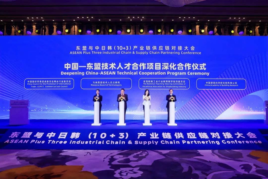 紧接着,中国国际贸易促进委员会商业行业委员会与马来西亚技术人员注册局、全国船舶工业行业教育教学指导委员会、中国建筑科学研究院有限公司在会上举行了中国—东盟技术人才合作项目深化合作仪式,标志着中国东盟技术人才合作项目进入了新阶段,合作将进一步深入到船舶工业和建筑行业应用中,有力推动区域内技术标准的提升和高素质技术人才的培养。