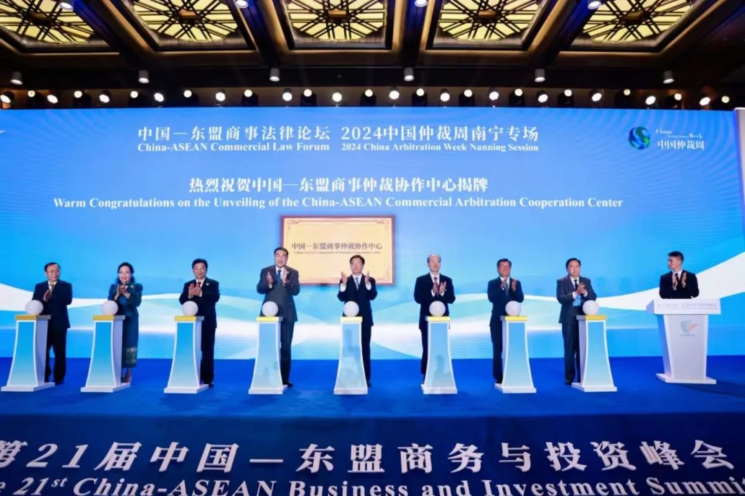 9月25日,中国—东盟商事仲裁协作中心(以下简称协作中心)在广西南宁举行的中国—东盟商事法律论坛上揭牌。见证这一盛举的有广西壮族自治区党委常委、政法委书记苗庆旺,中华人民共和国司法部副部长李明征,中国贸促会副会长张少刚,世界知识产权组织副总干事王彬颖,广西壮族自治区高级人民法院院长黄海龙,柬埔寨司法部副国务秘书桑索福恩,老挝国家工商会副主席詹塔宋,缅甸工商联合会副主席温锡都,越南工商会常务副主席裴忠义等。