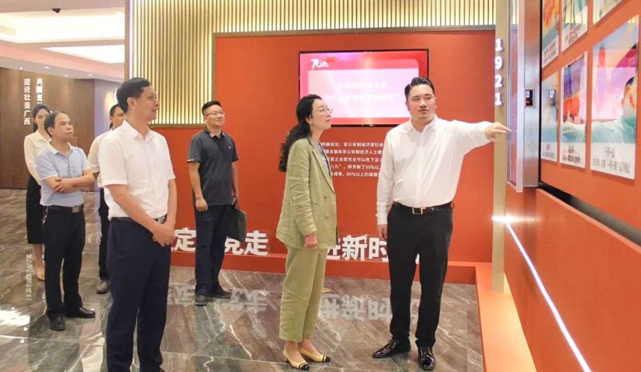 为服务企业共享国内国际双循环市场经营便利地,10月21日,广西贸促会、广西国际商会会长杨雁雁率队赴商会副会长企业广西华控投资集团走访调研。