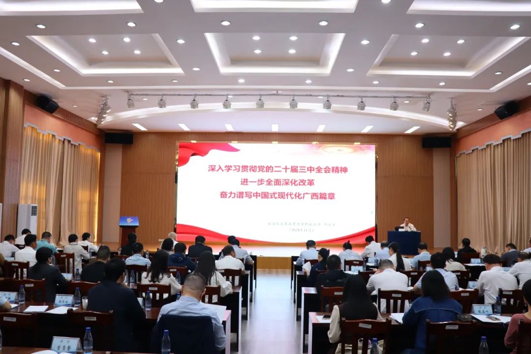 为深入学习贯彻党的二十届三中全会精神和习近平总书记对广西工作论述的重要要求,11月12日,2024年全区贸促系统和重点企业党性修养及经贸业务能力提升培训在广西南宁举行。自治区党委改革办专职副主任何运安围绕“深入学习贯彻党的二十届三中全会精神 进一步全面深化改革 奋力谱写中国式现代化广西篇章”作专题授课。