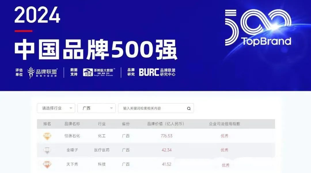 广西三个企业品牌:广西金嗓子、广西恒逸石化、广西天下秀,上榜2024中国品牌500强;广西品牌建设促进会会员单位广西参湾食品有限公司,广西梧州井泉酒业有限公司旗下品牌谢氏参湾码头、井泉酒业,荣获中国品牌节金谱奖。