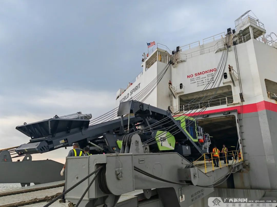 ▲今年7月,美斯达移动破碎筛分设备在国内港口装船后发运至东盟国家。广西美斯达集团有限公司供图