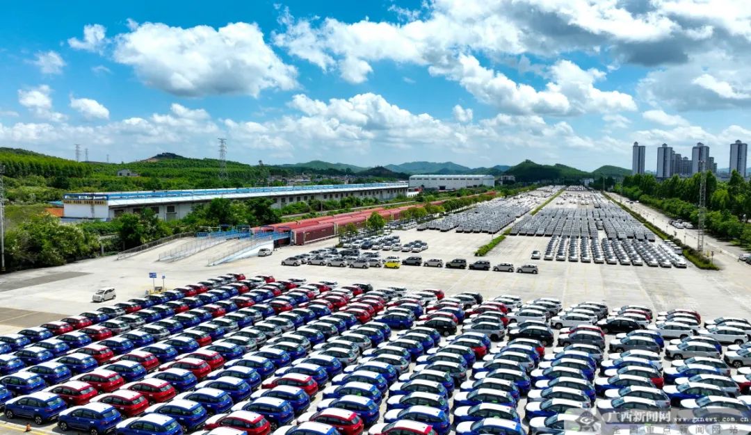 ▲8月3日,在柳州雒容汽车物流基地,工作人员正在装运柳州产汽车。今年7月该物流基地开行柳州至钦州汽配件铁海联运班列以来,为汽车出口海外搭建了一条更加快捷的运输通道,实现班列+班轮无缝衔接。黎寒池 摄