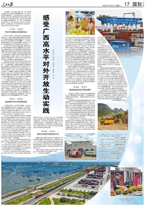 一湾相挽十一国,良性互动东中西。作为中国面向东盟开放合作的前沿和高质量共建“一带一路”有机衔接的重要窗口,广西壮族自治区近年来着力向海图强、开放发展,不断把独特的区位优势转化为强劲的发展优势,积极服务中国—东盟命运共同体建设,深度融入高质量共建“一带一路”,为区域发展创造机遇与活力。本报记者走进广西崇左、钦州等地,聚焦产业、基础设施、平台体系建设等,实地感受广西高水平对外开放的生动实践。