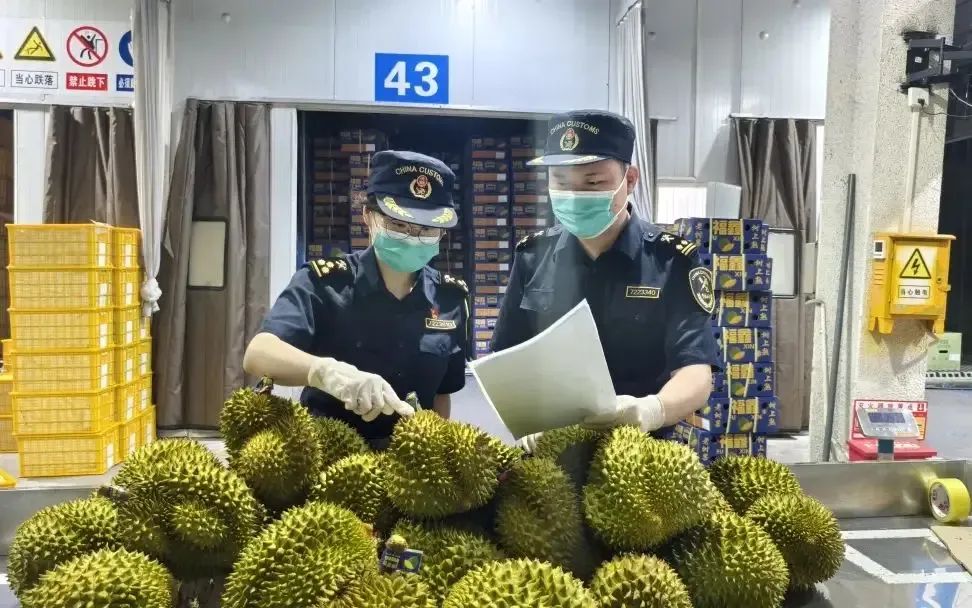 ▲在广西凭祥友谊关口岸海关查验平台,工作人员在查验一批进口榴莲。图源人民网