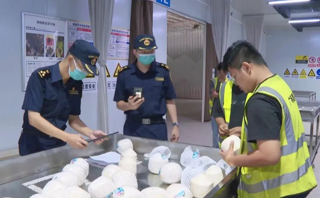 ▲海关关员对越南进口椰子进行查验。图源凭祥市融媒体中心