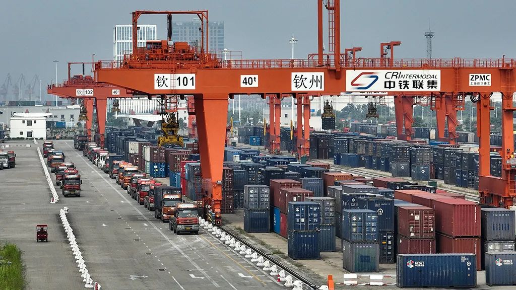 北部湾畔,开放潮涌。智能桥吊自动精准卸载货物,无人驾驶集装箱卡车来回穿梭;一列列满载货物的铁海联运班列驶离港区;一艘艘完成装卸作业的远洋巨轮驶向远方。