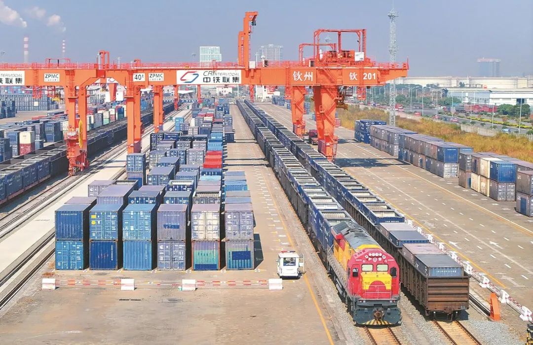 在钦州港东站,不时有海铁联运班列抵达或者驶离,东南亚国家的水果、橡胶、起酥油、纸浆由此进入我国;国产的汽车配件、摩托车散件、发电机配件则一路南下,出口至东南亚。
