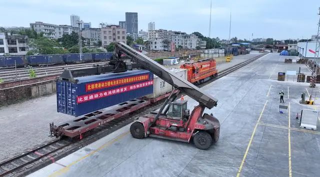 11月19日,一列载着比亚迪新能源动力锂电池的列车,从重庆长寿区渝巴专用铁路发车,沿着西部陆海新通道南下,于22日驶入广西北部湾防城港新宏光铁路专用线。随着接卡作业的完成,全国首次铁路发运动力锂电池在北部湾港顺利接卸。