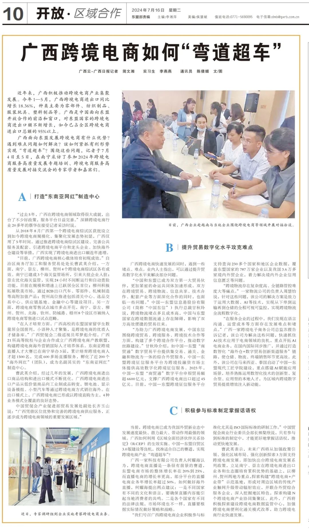 2024年7月16日,《广西日报》开放版头条刊发2024年跨境电商服务高质量发展专题培训、跨境电商服务高质量发展对接交流会活动综述,全文如下。
