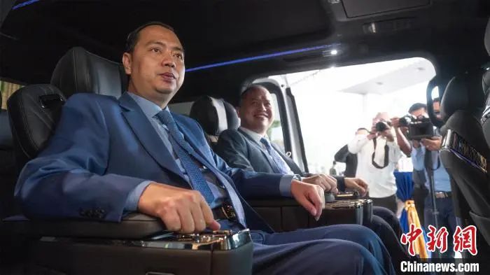 当地时间7月20日,柬埔寨新闻部大臣奈帕德拉体验新能源汽车。(图片摄影:Ploy)