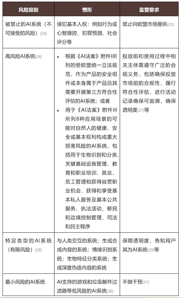 《AI法案》采取了风险分级管理的监管思路,将AI系统分为以下四个级别,分别施以不同的监管要求: