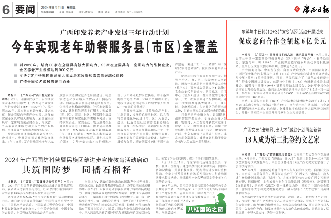9月11日刊发的《广西日报》报道:东盟与中日韩(10+3)“链接”系列活动开展以来促成意向合作金额超6亿美元。