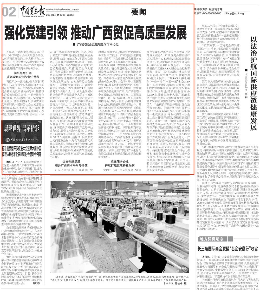 9月12日,《中国贸易报》刊发中共广西贸促会党组理论学习中心组署名文章《强化党建引领 推动广西贸促高质量发展》。特此转发,以飨读者。