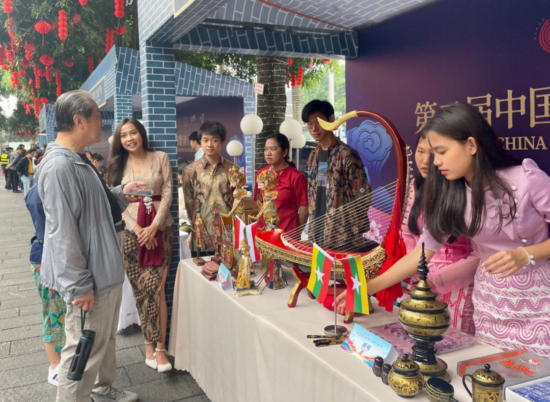 中国赣南客家擂茶、西湖绸伞,越南手工藤编工艺品、缅甸漆器制作技艺……来自中国和东盟各国的非遗美食、手工艺品进驻非遗大集市,让每个展位人气爆棚。