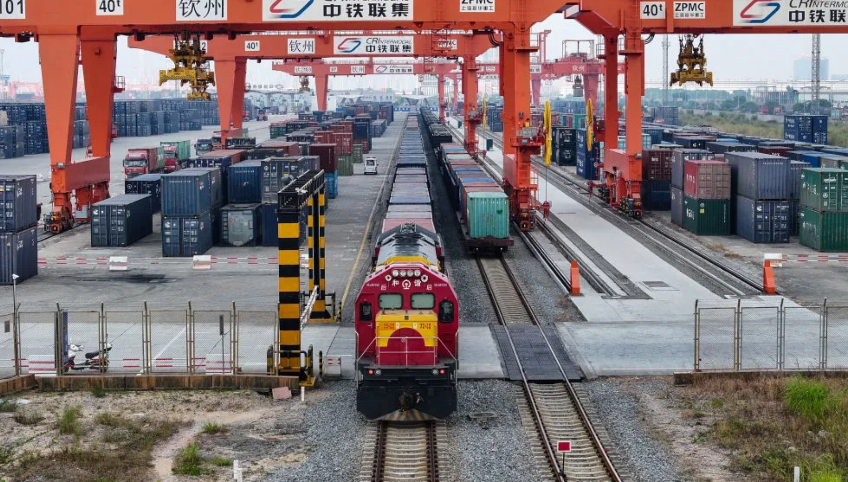 2024年3月8日,在南宁国际铁路港,一列中越班列准备发往越南河内。西部陆海新通道铁海联运班列和中欧班列、中越班列、中老铁路等相互衔接联通,搭建起“多向延伸、海陆互联”的运输服务网络,中国西部地区面向东盟的国际大通道日趋通达。