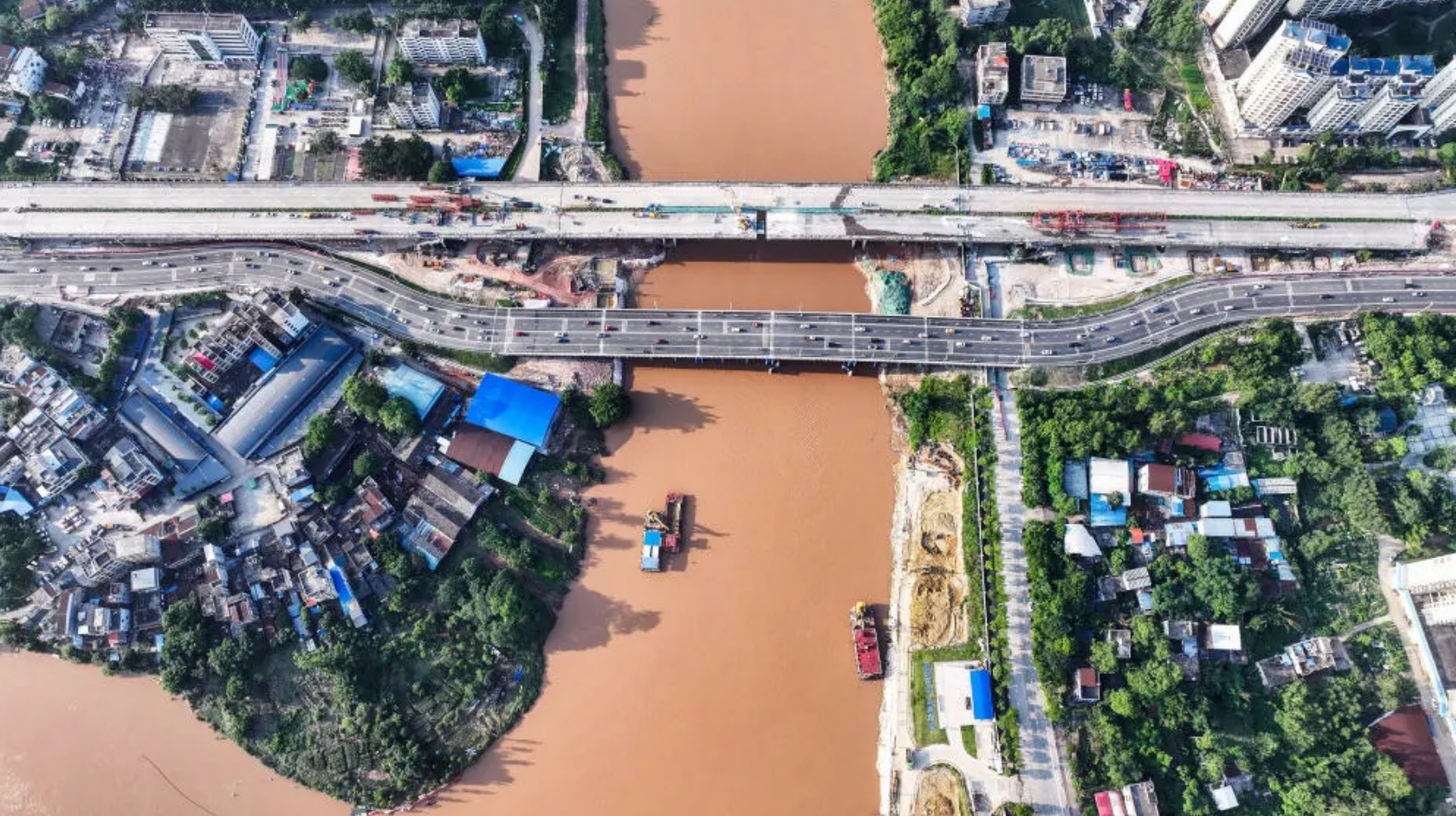 施工队在广西钦州市拆旧桥建新桥,疏浚平陆运河流经钦州市区的航道(2024年5月12日摄,无人机照片)。平陆运河建成后将成为广西及西南地区通往东盟地区运距最短、最便捷的水运出海通道。