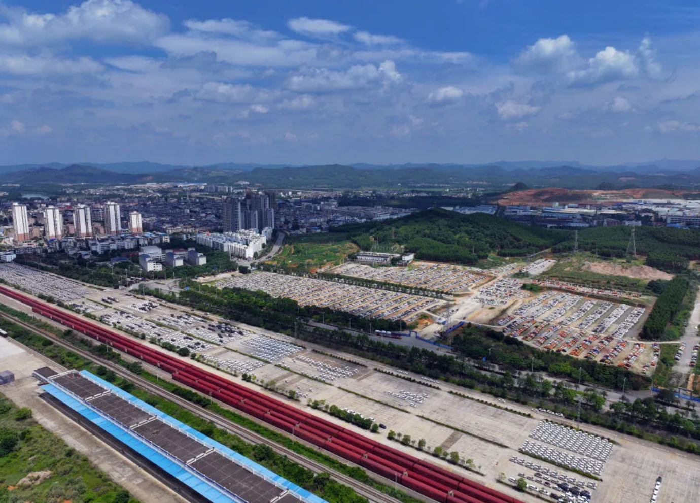 汽车在广西柳州雒容汽车物流基地等待进入铁路货车车厢。部分出口的新能源汽车从这里装车运往各大出海港口(2024年5月24日摄,无人机照片)。