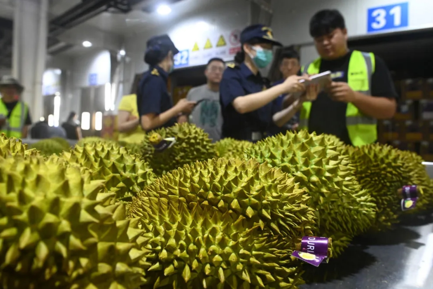 2024年8月26日,工作人员在广西凭祥市友谊关口岸海关查验平台查验一批进口榴莲。友谊关口岸是东盟水果进入中国的重要陆路通道。