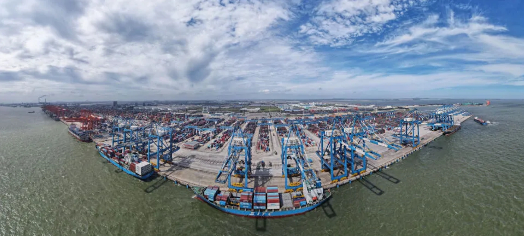 2024年6月13日,途经马来西亚关丹港的“海丰博多”轮在广西钦州港集装箱装卸自动化码头进行装卸作业(无人机全景照片)。