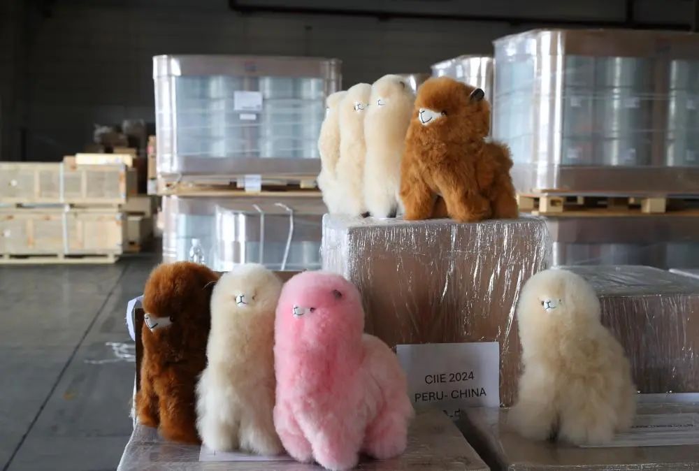 10月14日拍摄的运抵中远海运自有仓库的“温暖驼”产品。当日,中远海运承运的第七届进博会海运首单展品秘鲁“温暖驼”系列产品由洋山港码头运抵中远海运自有仓库,随后改换短驳厢式车送往客户公司。新华社记者方喆摄