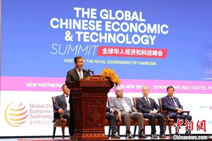 当地时间11月26日,全球华人经济和科技峰会在金边举行。图为柬埔寨首相洪玛奈致辞。项薪宇 摄