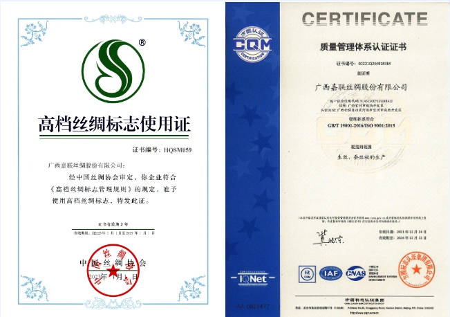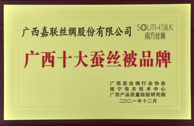 广西嘉联丝绸先后获得农业产业化国家重点龙头企业、广西扶贫龙头企业、广西工业龙头企业、国家民品定点生产企业、广西供应深圳农产品示范基地、广西科普教育基地、国家AAA级旅游景区等认定。荣获宜州区首届市长质量奖、河池市第三届市长质量奖,是中国高档丝绸标志授权使用单位。公司产品获得国家生态原产地保护产品、国家绿色设计产品、OEKO-TEX STANDARD100国际生态纺织品认证、GOTS全球有机纺织品认证、中国国际农产品交易会参展农产品金奖、广西名牌产品、广西著名商标、广西十大生丝、广西十大蚕丝被等荣誉认定,品牌影响力和行业知名度逐步扩大。