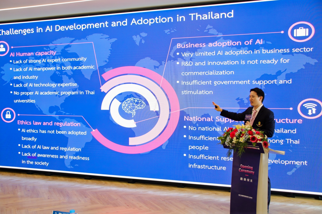 朱拉隆功大学教授马振诚作为特邀嘉宾,围绕“AI赋能打造营销新生态”的主题进行了精彩的分享。不仅深入剖析了AI技术在数字营销领域的广泛应用与深远影响,更为大赛注入了前沿的洞察与启示。泰国国家科技发展署副主任萨纳特·翁萨维通、泰国中小企业发展银行企业家发展与支持部高级客户总监沙格特·拉达克、中国科学院曼谷创新合作中心执行主任王俊伟、泰国华人青年总商会副秘书长蔡奕园、泰中侨商联合会副主席马宁伽等代表也到达现场,共同见证了这一活动。