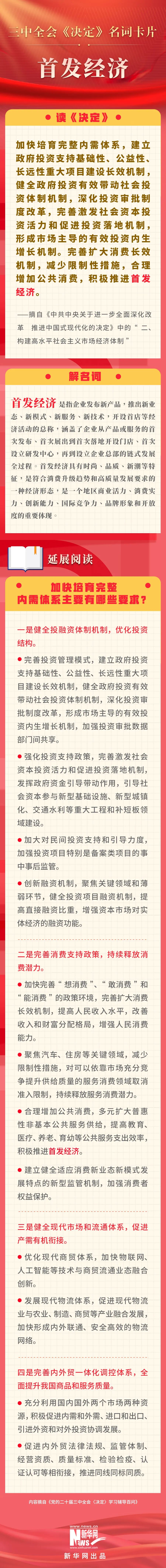 党的二十届三中全会审议通过的《中共中央关于进一步全面深化改革、推进中国式现代化的决定》指出:“完善扩大消费长效机制,减少限制性措施,合理增加公共消费,积极推进首发经济。”