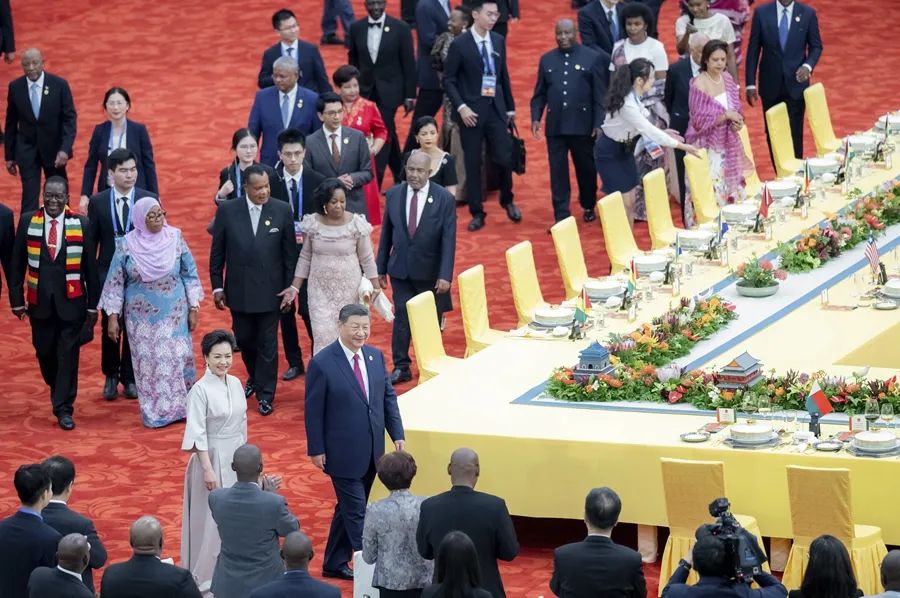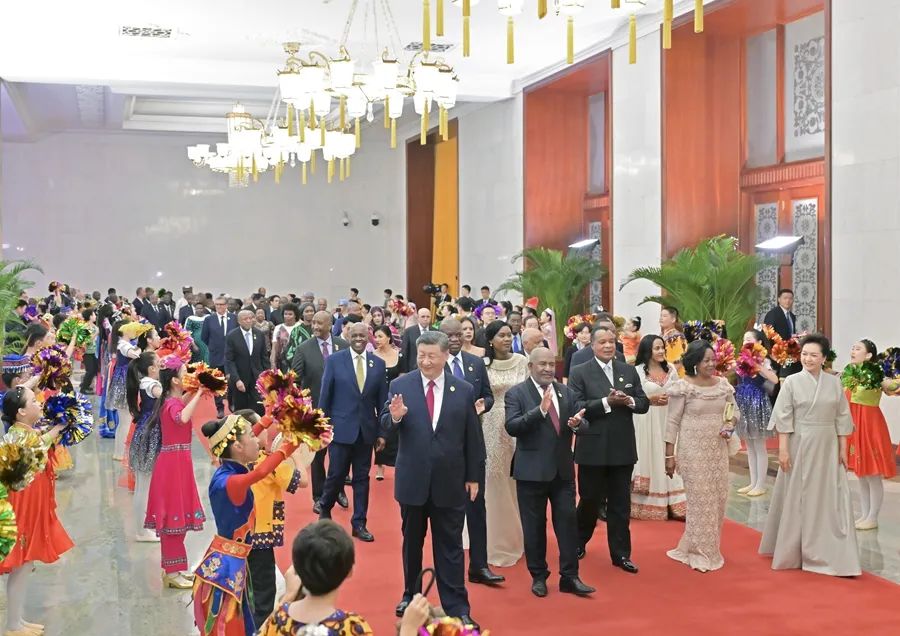 宴会后,习近平和彭丽媛同贵宾们共同观看《携手同行,共筑未来》文艺演出。演出展现了中非多彩文明美美与共、中非人民相知相亲,赢得阵阵热烈掌声。