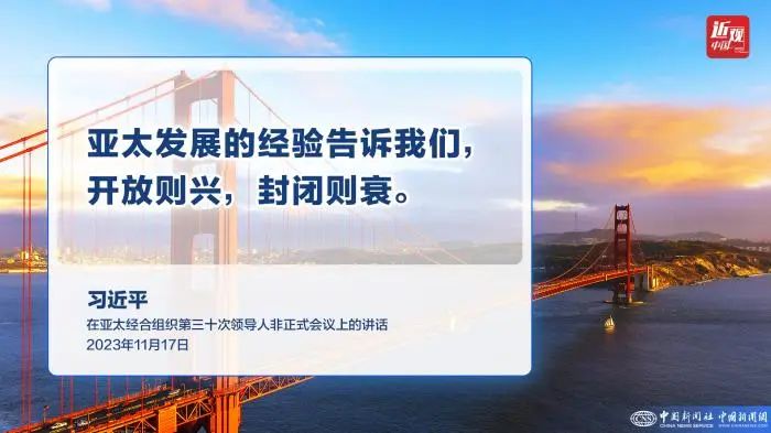 2023年11月17日,亚太经合组织第三十次领导人非正式会议在美国旧金山莫斯科尼中心举行。国家主席习近平出席会议并发表题为《坚守初心 团结合作 携手共促亚太高质量增长》的重要讲话。