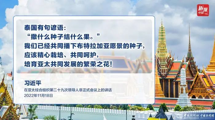 习近平指出,泰国有句谚语:“撒什么种子结什么果。”我们已经共同播下布特拉加亚愿景的种子,应该精心栽培、共同呵护,培育亚太共同发展的繁荣之花!