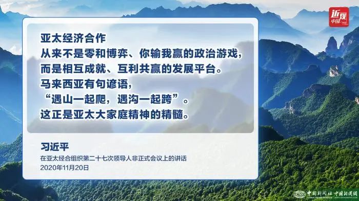习近平指出,亚太各成员发展高度互补,利益深度融合。亚太经济合作从来不是零和博弈、你输我赢的政治游戏,而是相互成就、互利共赢的发展平台。马来西亚有句谚语,“遇山一起爬,遇沟一起跨”。这正是亚太大家庭精神的精髓。疫情再度告诉我们,只有团结合作,才能战胜挑战。我们要深化互信、包容、合作、共赢的亚太伙伴关系,秉持共商共建共享理念,不断提升区域合作水平,做大亚太合作蛋糕,实现共同繁荣。我们要在协商一致基础上推进务实合作,妥善处理矛盾和分歧,维护亚太合作正确方向,让亚太经合组织行稳致远。