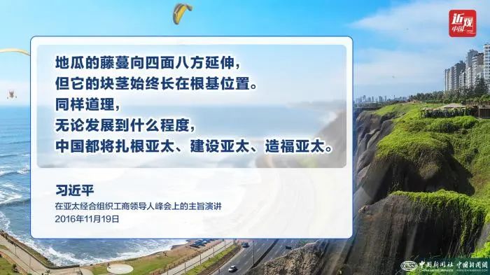 习近平指出,大家都知道,拉美是地瓜等薯类作物的原产地。我曾给中国一些企业家举过地瓜的例子。地瓜的藤蔓向四面八方延伸,但它的块茎始终长在根基位置。同样道理,无论发展到什么程度,中国都将扎根亚太、建设亚太、造福亚太。中国坚定不移走和平发展道路,奉行互利共赢的开放战略,在谋求自身发展的同时积极带动亚太国家共同发展,为本地区人民创造更多机遇。