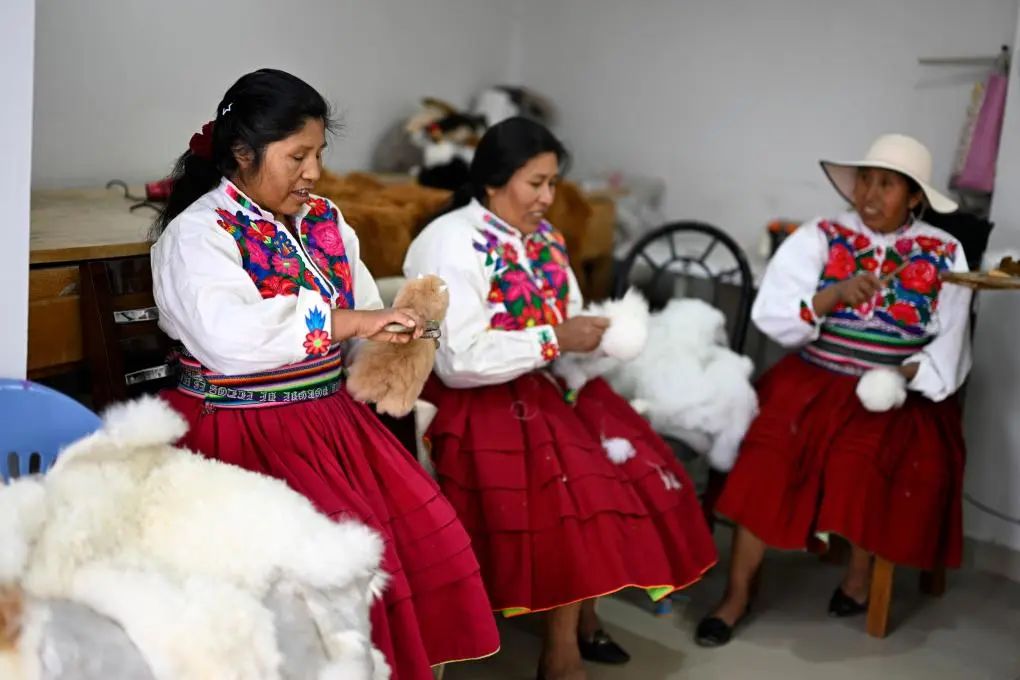 在秘鲁阿雷基帕,工作人员在羊驼毛制品手工艺人奥斯瓦尔多·马马尼的工坊制作羊驼玩偶。通过连续参展进博会,羊驼毛制品在中国市场大受欢迎。新华社记者李木子摄