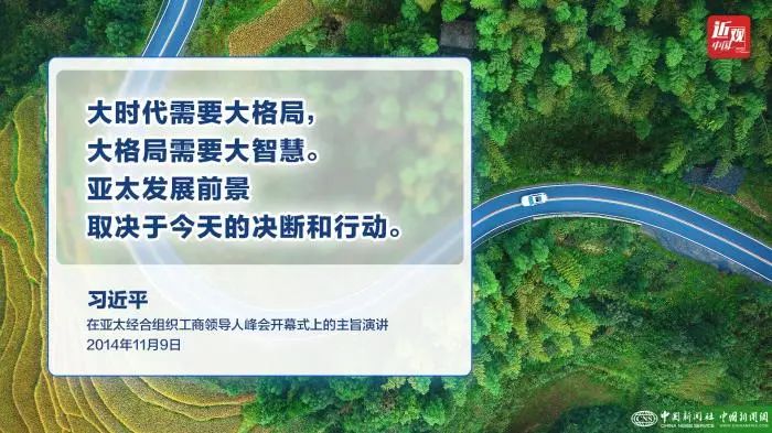 习近平提出,大时代需要大格局,大格局需要大智慧。亚太发展前景取决于今天的决断和行动。我们有责任为本地区人民创造和实现亚太梦想。这个梦想,就是坚持亚太大家庭精神和命运共同体意识,顺应和平、发展、合作、共赢的时代潮流,共同致力于亚太繁荣进步;就是继续引领世界发展大势,为人类福祉作出更大贡献;就是让经济更有活力,贸易更加自由,投资更加便利,道路更加通畅,人与人交往更加密切;就是让人民过上更加安宁富足的生活,让孩子们成长得更好、工作得更好、生活得更好。