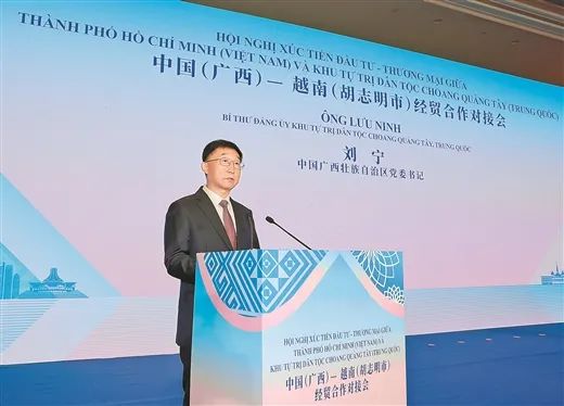 自治区党委书记刘宁出席在越南举行的中国(广西)—越南(胡志明市)经贸合作对接会并致辞。图源广西云-广西日报 记者黄克/摄